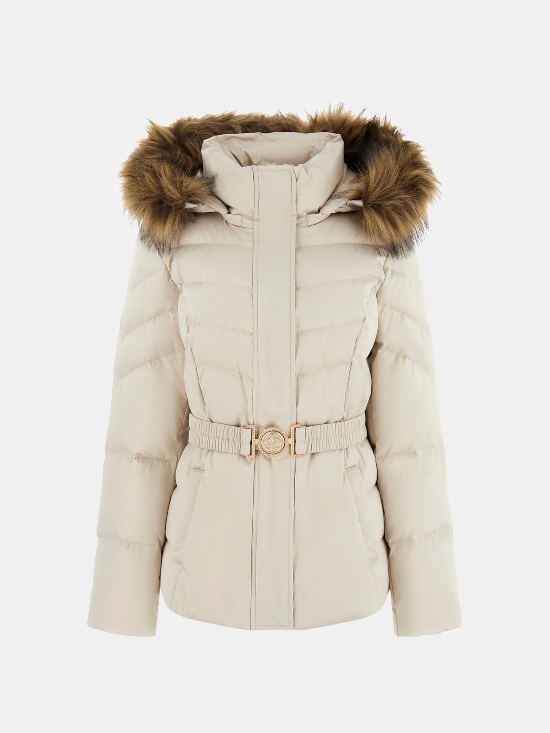 Cappuccio con finiture in pelliccia sintetica e manica lunga.