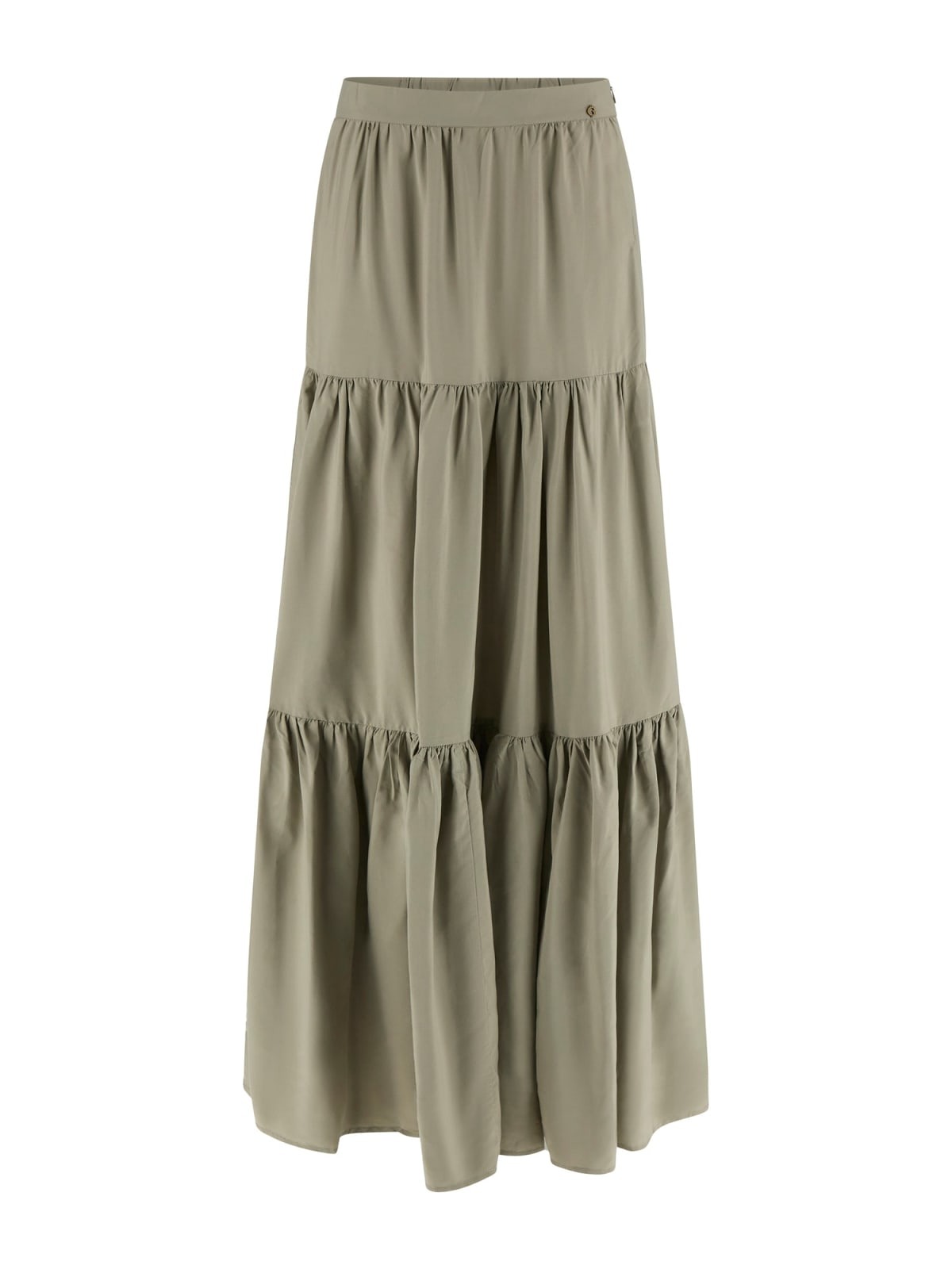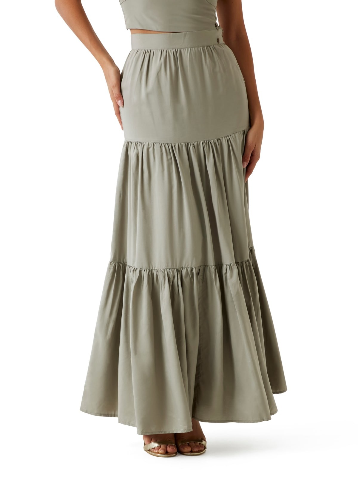 Gonna maxi a vita alta con due balze a gradoni. Volume e movimento ad ogni passo.