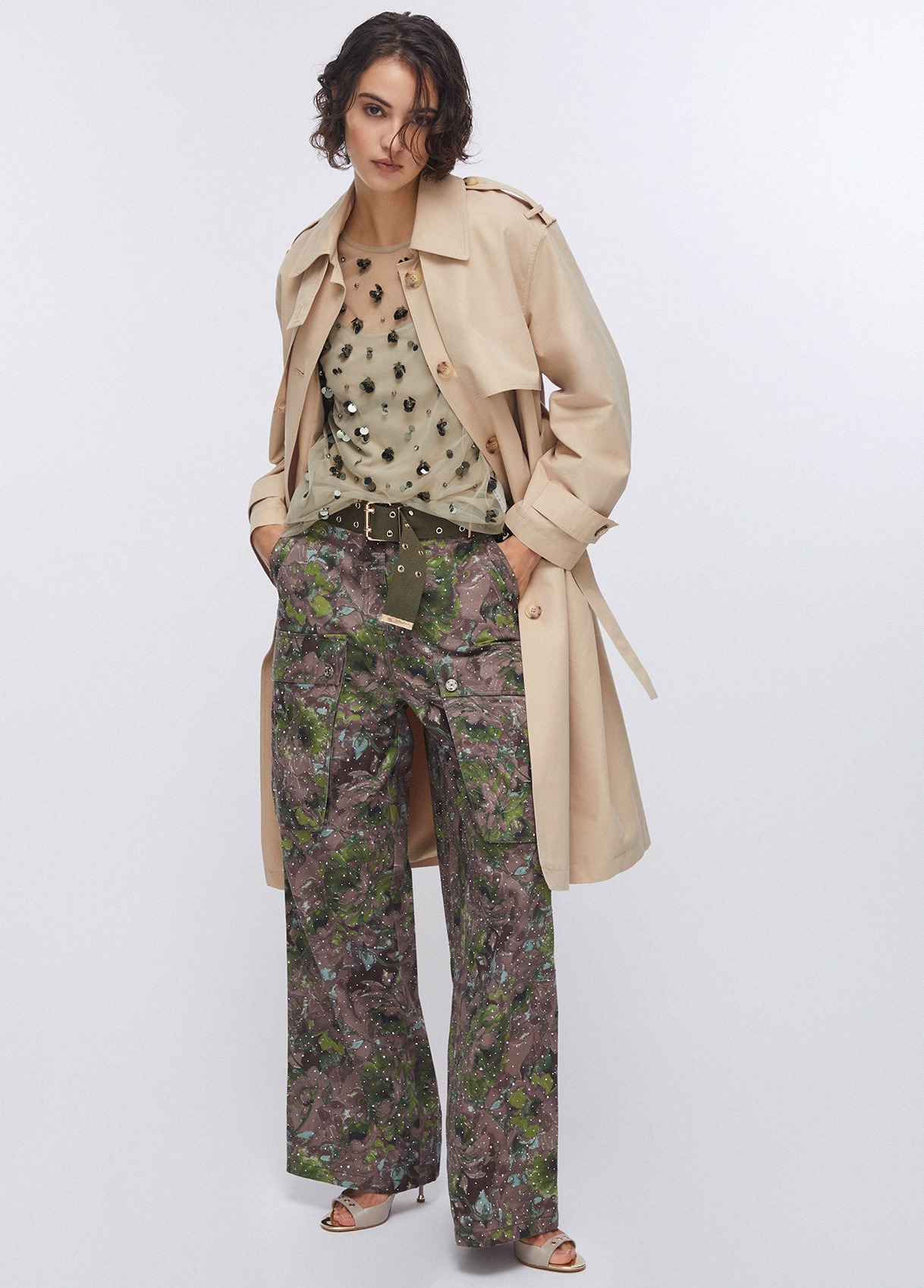 Tessuto principale: 100% Poliestere| RICAMI E DECORAZIONI: 43% PVC per uso tessile (Cloruro di polivinile), 32% Vetro, 15% Bronzo, 10% Acrilica