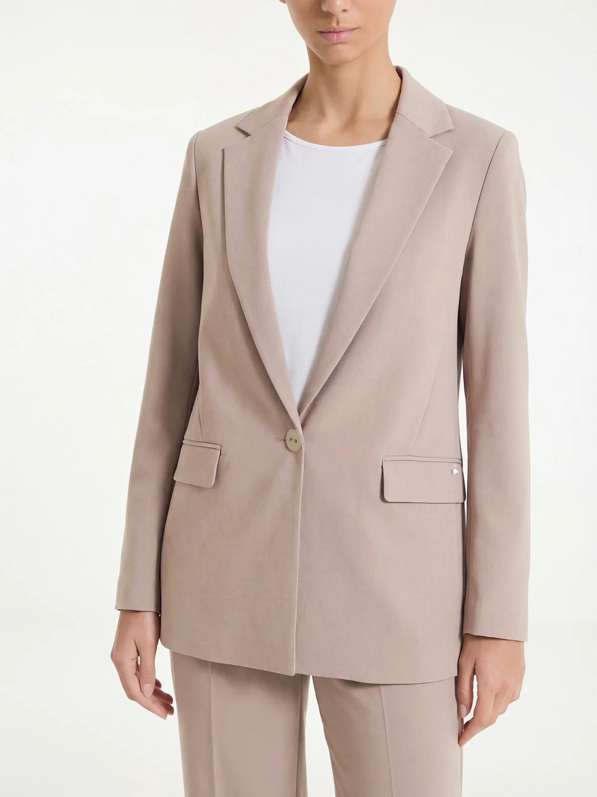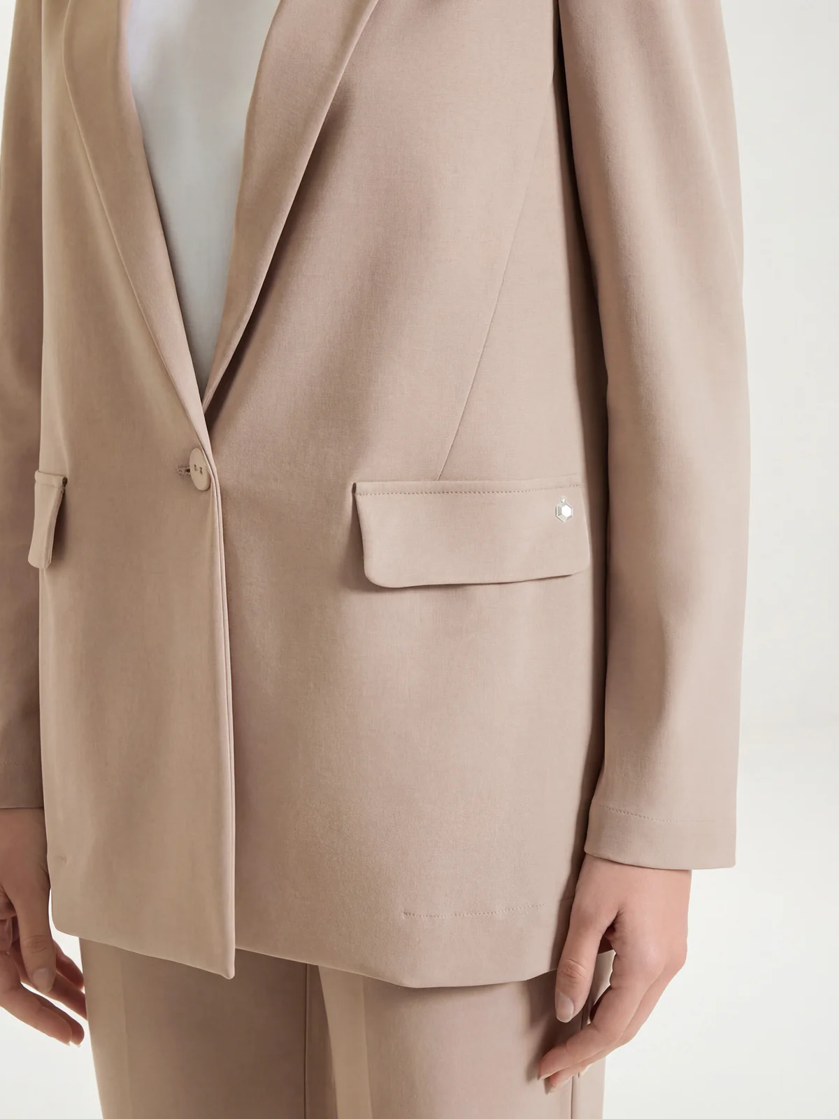 Questo modello over è costruito con un collo con revers che valorizza la scollatura, una chiusura a un bottone che definisce la linea e tasche applicate che completano il design con un dettaglio pratico e moderno.
